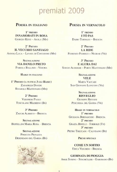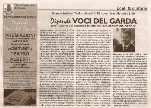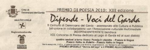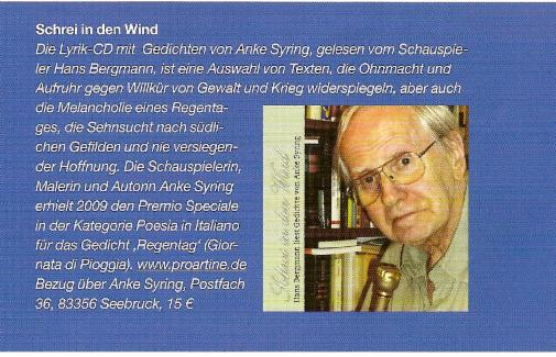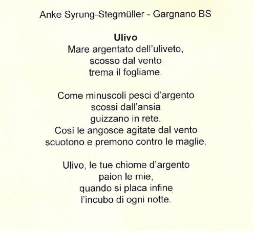 Zum 13. mal wurde in Desenzano am Gardasee der jährliche "Concorso di Poesia" aus- getragen. Wie bereits im letzten Jahr ging der "Premio Speciale" wieder an die am Chiem- see lebende Künstlerin Anke Syring, die einen Großteil des Jahres in ihrem Atelier "Le Posere" in Gargnano verbringt.