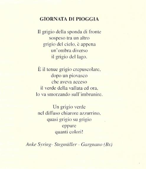Die am Gardasee lebende Schauspielerin, Malerin und Autorin Anke Syring erhielt am 29.11.2009 für ihr Gedicht "Giornata di Pioggia" ( Regentag ) den Premio Speciale des XII Poesiewettbewerbes, der von der Stadt Desenzano und der Zeitung "Dipende Giornale del Garda" vergeben wurde.