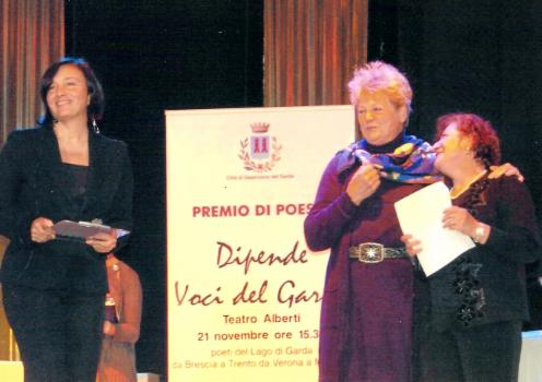 Den Preis überreichte der Bürgermeister von Desenzano, Felice Anelli. Rechts neben ihm die Dichterin Velise Bonfante und am Mikrofon Raffaella Visconti.
